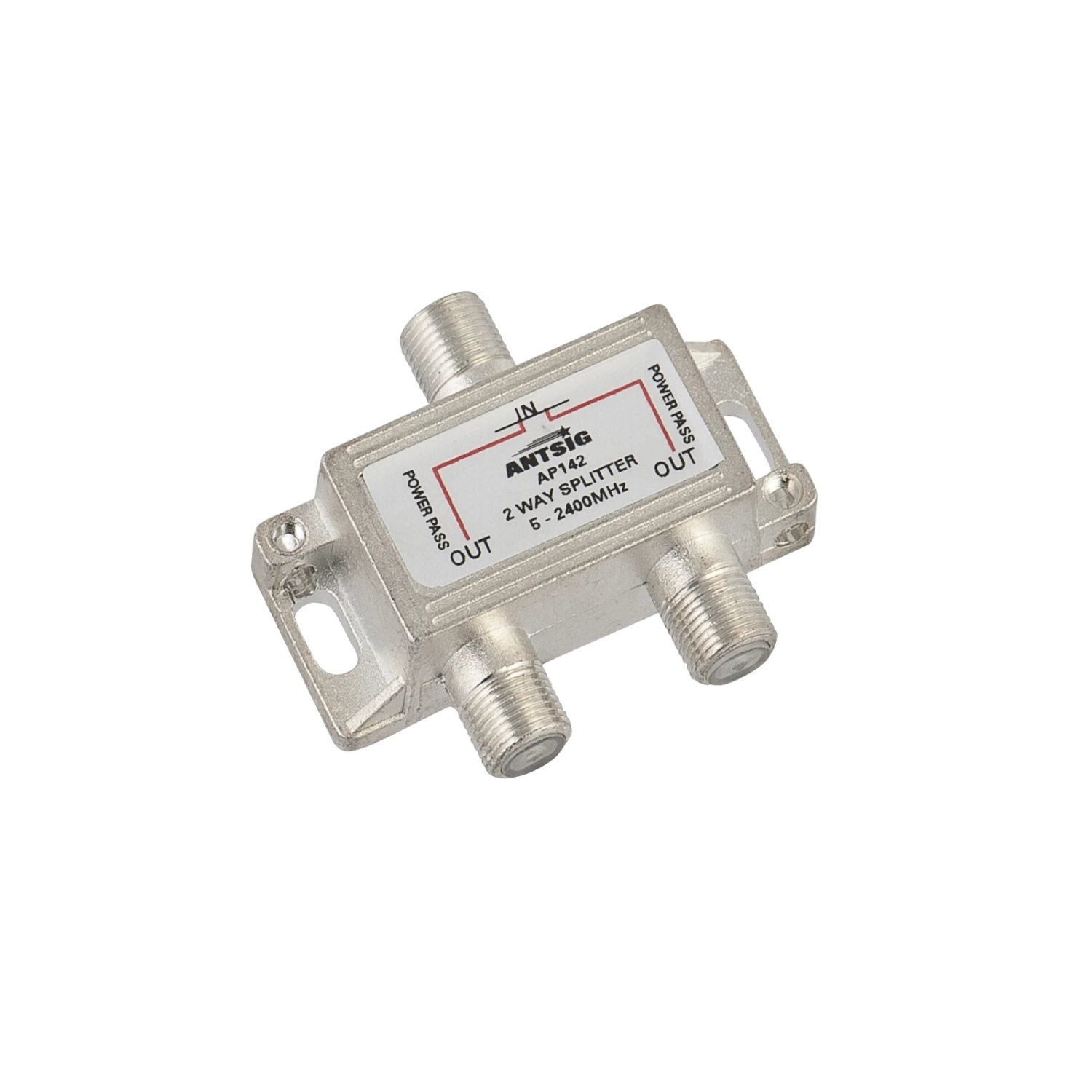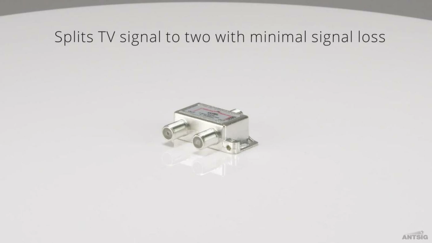 The Antsig two way splitter splits TV signal to two with minimum interference and loss of use for digital TV applications. Provided with power pass path for use with masthead amplifier installations.