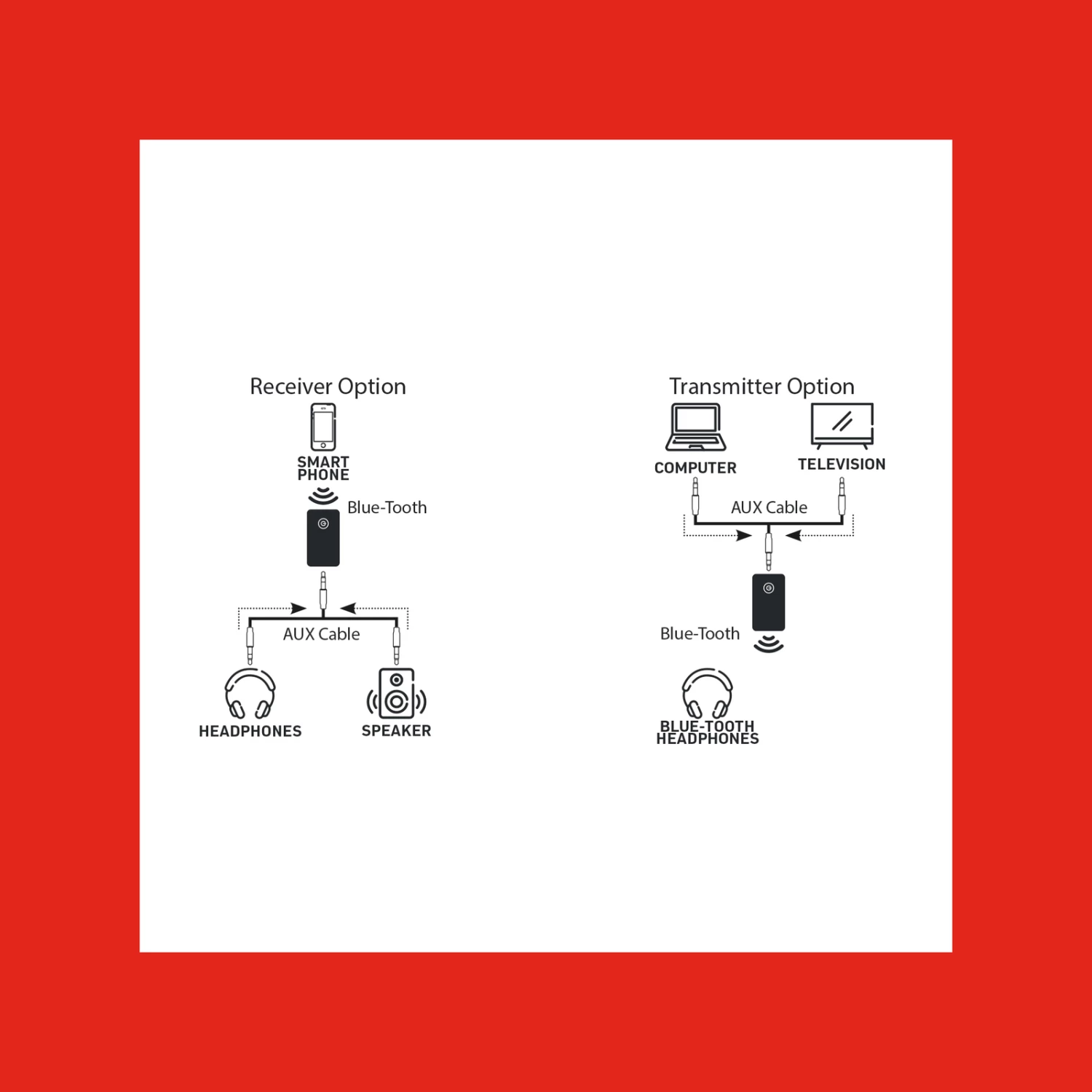 - Transmitter Mode Example : Connect this bluetooth device to a TV or any Audio source via Aux cable and transmit the signal wirelessly to a bluetooth headphone or speaker.Receiver Mode Example : Connect this bluetooth device to a wired headphone or speaker via Aux cable and transmit the signal wirelessly from a bluetooth enabled device audio source such as a mobile phone.